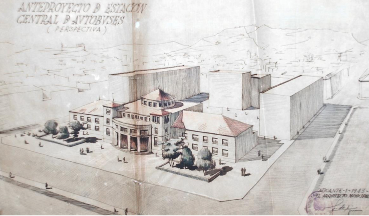 Este dibujo del arquitecto Félix de Azúa para la estación representa el edificio en una fase inicial del proyecto. Viendo su extraño (visto desde ahora) clasicismo y su aparente poca funcionalidad, que no encaja para nada con nuestra vivencia racionalista del edificio, nos preguntamos qué paso entre aquel enero de 1943 y el diseño final del proyecto.