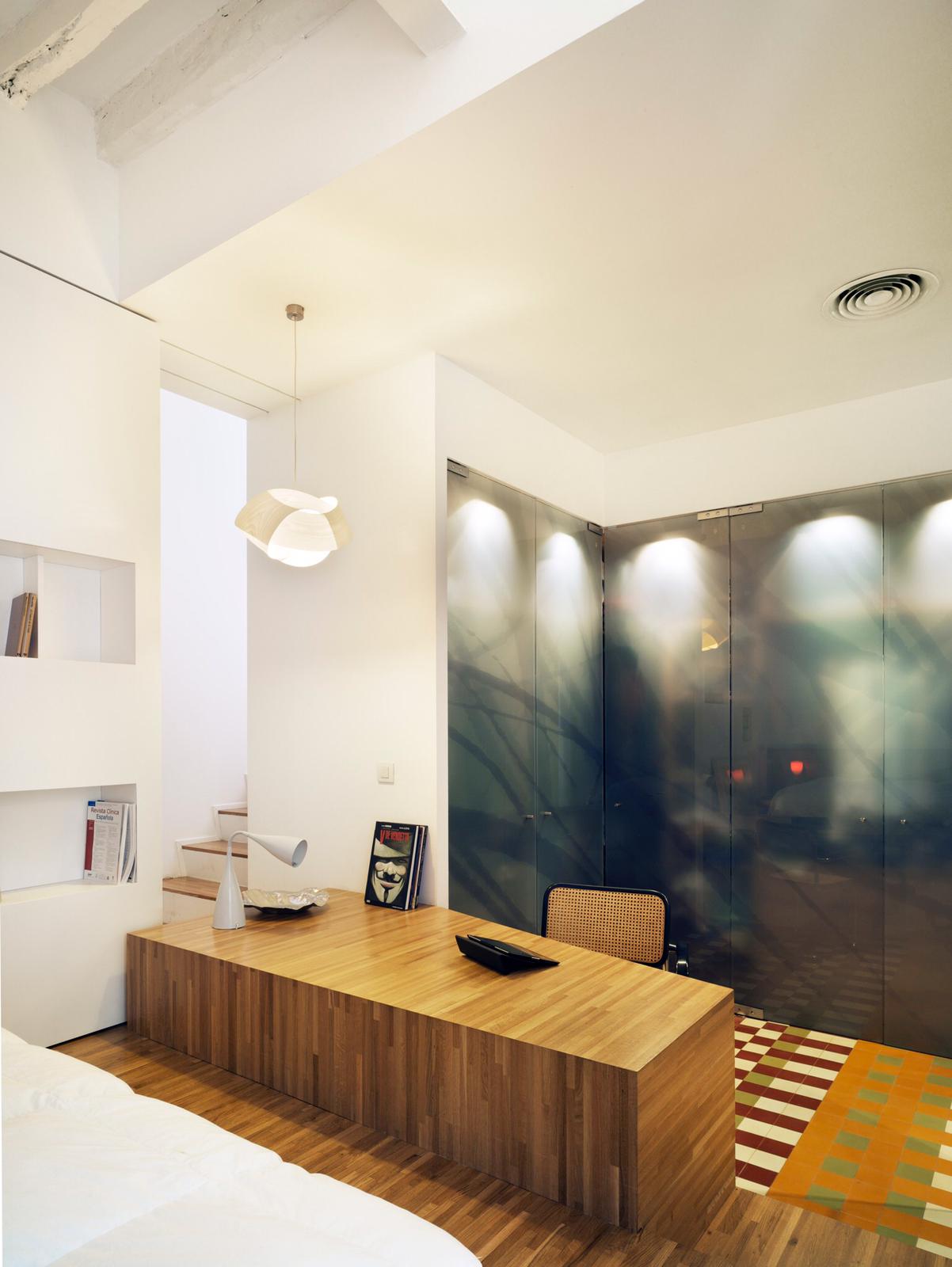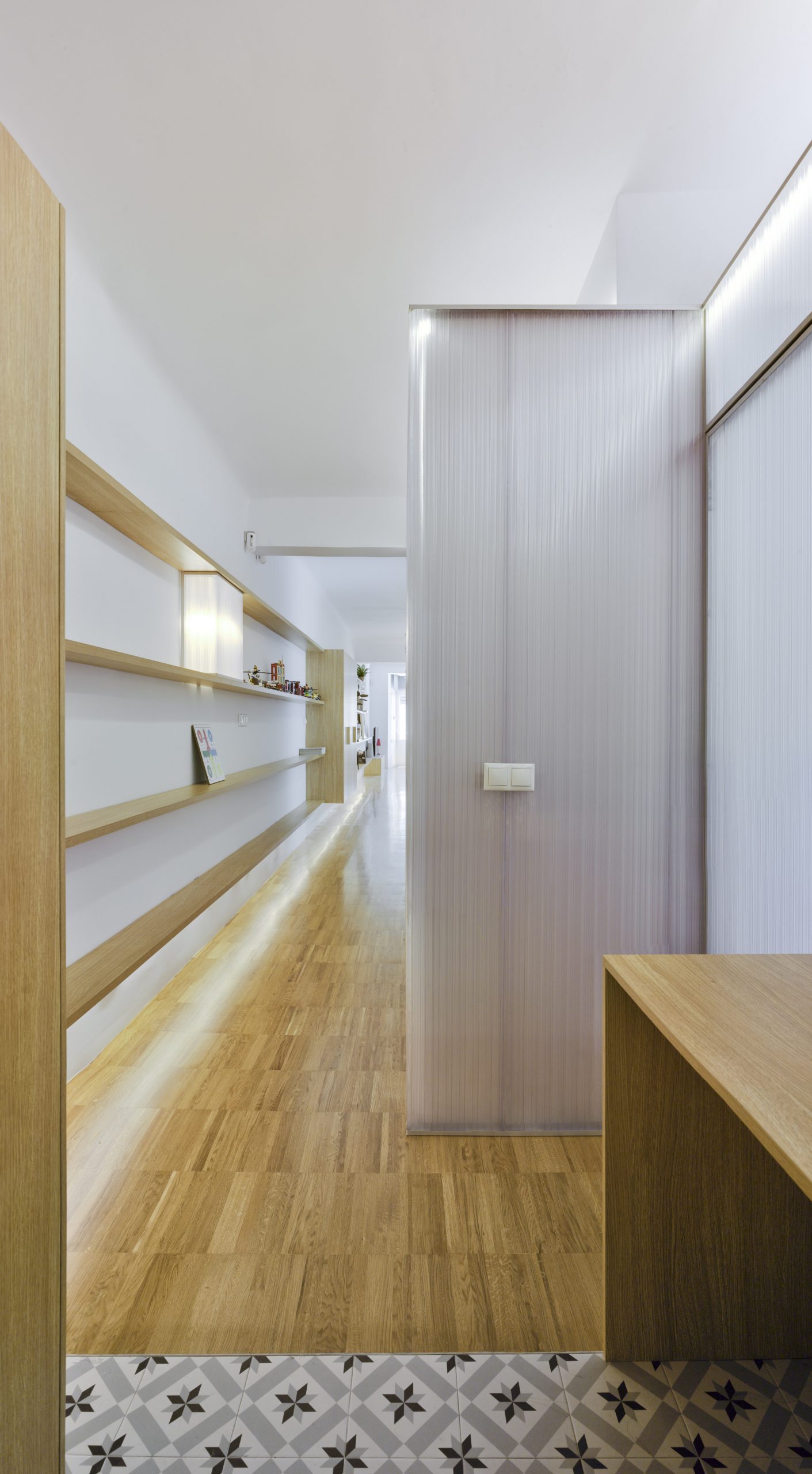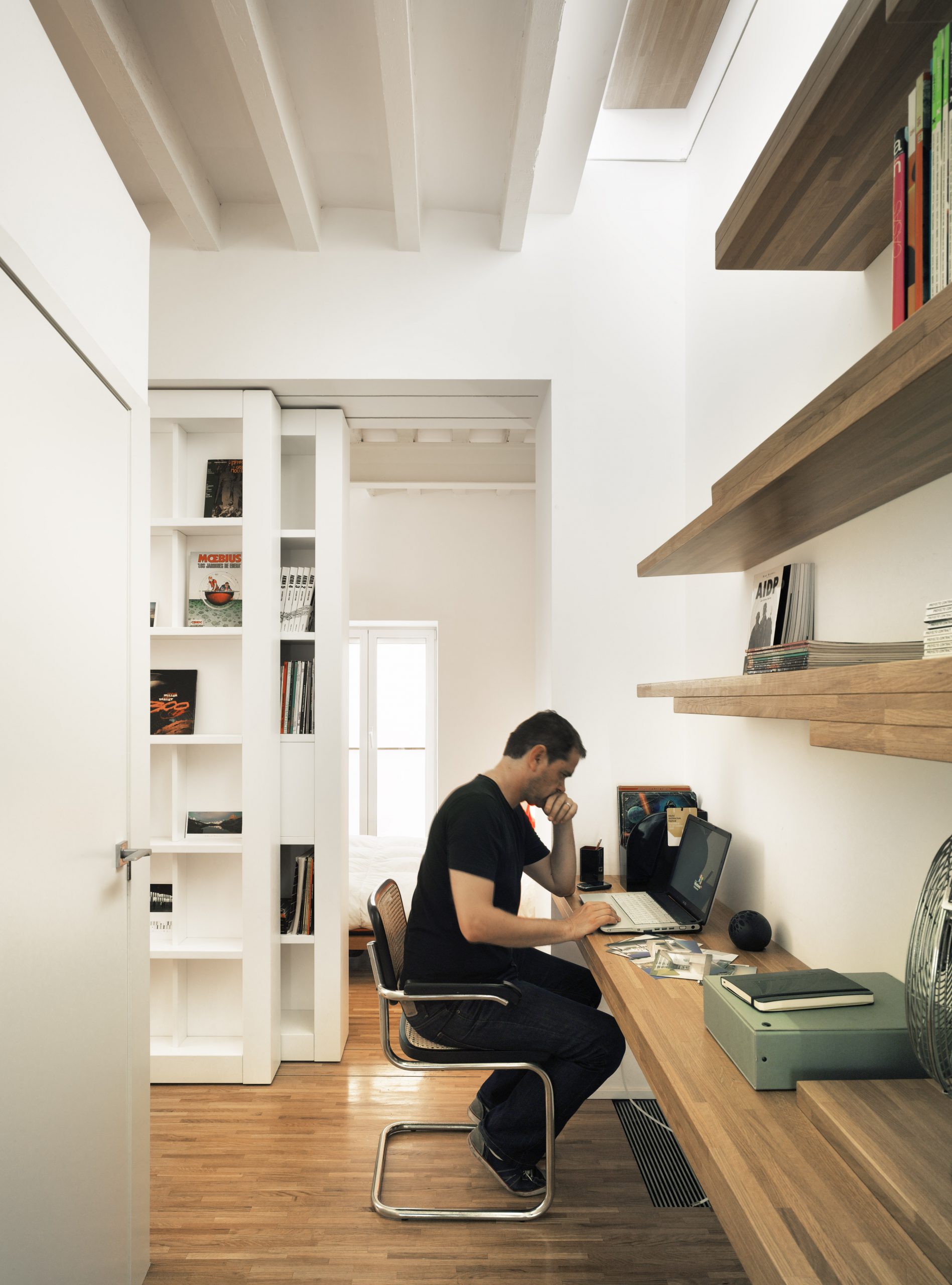 Como hemos comentado la hibridación de los espacios de circulación siempre ha sido una premisa. La cantidad de metros cuadrados utilizados con el único fin que a los desplazamientos dentro de la vivienda siempre nos han parecido un despropósito. Una solución que hemos planteado es la de generar pequeños espacios de trabajo y biblioteca unidos a los espacios de circulación. Por unos pocos centímetros mas, los pasillos se reconvierten en bibliotecas y estas con pequeñas distorsiones en despachos fijos o retráctiles. Espacios que se utilizan cuando el Open Space de la mesa del salón comienza a limitar la concentración de sus usuarios y por ende su rendimiento.