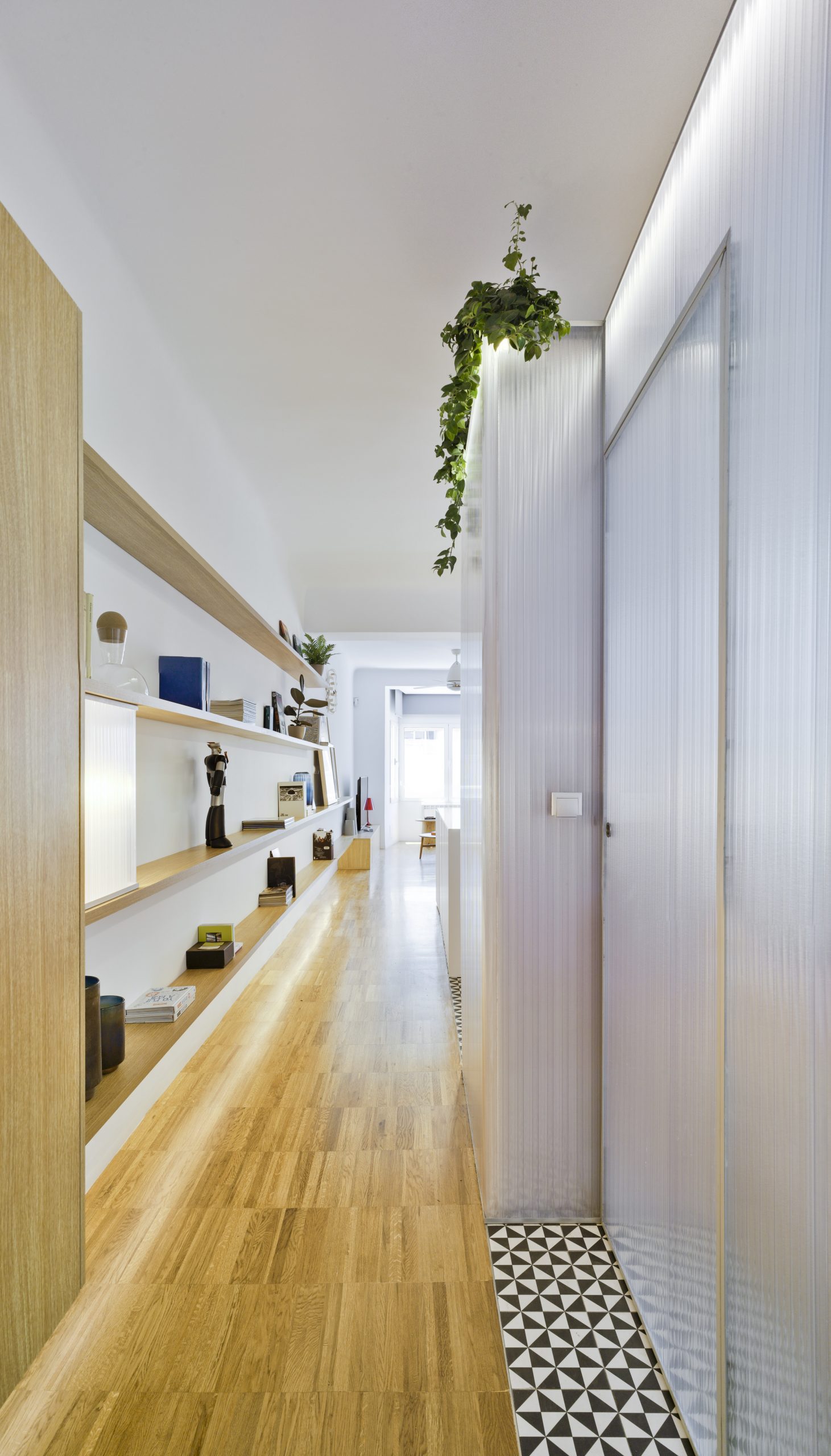 La solución de la estantería reconvertida es un clásico de Crystalzoo, ya no solo en los espacios de circulación sino también en los estanciales. Diseñar la estantería de forma que sea capaz de adaptarse a un espacio de trabajo a escala domestica implica anticipación proyectual para poder generar la adaptación necesaria en un momento dado para convertir tu hogar en un nuevo home office. A fin de cuentas no es mas que la aplicación de las enseñanzas de los arquitectos Charles y Ray Eames que promulgaban la hibridación entre la vida y los espacios de trabajo.